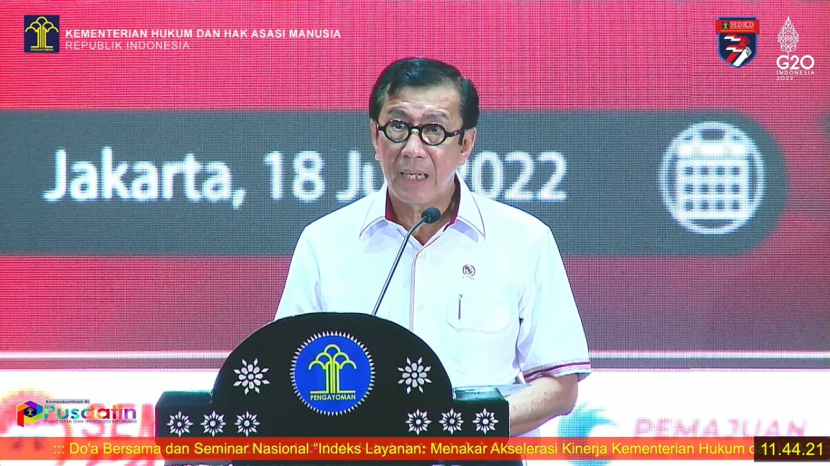 Menteri Hukum dan HAM RI, Yasonna H. Laoly membuka kegiatan Seminar Nasional secara resmi dan memberikan sambutan.