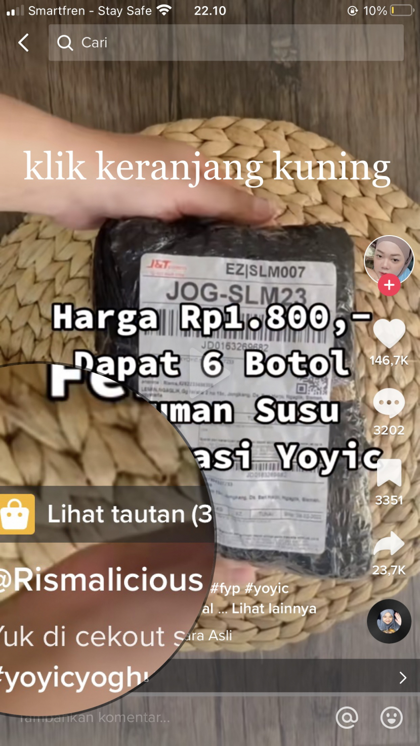 Brand susu fermentasi ini sedang gempar gemparnya untuk melakukan pemasaran melalui Celebrity Endorser di dalam suatu aplikasi yaitu Tiktok dan TiktokShop, yang dimana brand tersebut bekerja sama dengan Celebrity Tiktok yang mampu memberikan peluang agar penonton terpengaruh untuk segera membeli produk susu fermentasi yoyic ini karena dengan adanya diskon lebih dari 50% bagi pengguna pertama di Tiktok shop.