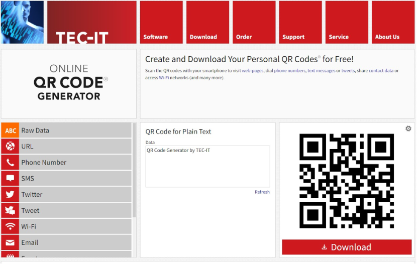 Selama lebih dari 20 tahun, qr code generator dari TEC-IT telah menciptakan perangkat lunak untuk barcode, pencetakan, dan juga pelabelan. Dengan qr code ini, kamu dapat menggunakannya untuk memformat data, email, URL, nomor telepon, Wi-Fi, program, dll. Caranya sangat mudah, yaitu dengan cara memilih jenis data, mengisi detailnya, lalu mengunduh qr code kamu.