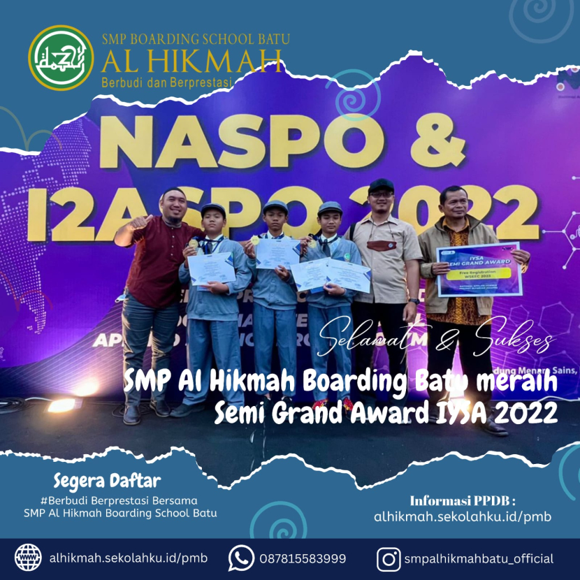 Setelah mengikuti rangkain perlombaan NASPO kali ini, tim SMP AL-Hikmah Boarding School Batu mendapatkan capaian yang luar biasa, yakni mendapatkan Gold Medal dalam kategori pengolahan limbah. Selain itu, SMP Al-Hikmah Boarding School Batu juga meraih Semi Grand Award IYSA 2022. Semoga dengan prestasi ini menambah semangat para siswa dalam belajar, sehingga mendaptakan prestasi-prestasi lainnya.