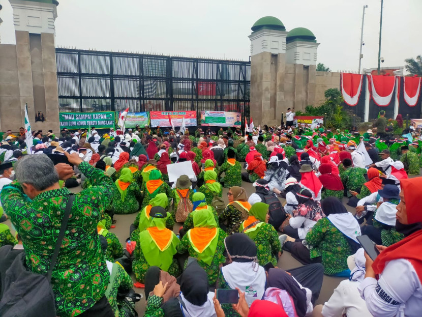 Jakarta-Guru inpassing madrasah swasta yang tergabung dalam PGIN (Perkumpulan Guru Inpassing Nasional) melakukan aksi unjuk rasa didepan gedung DPR,Jl Gatot Subroto, Jakarta Pusat,Senin(28/8/2023).