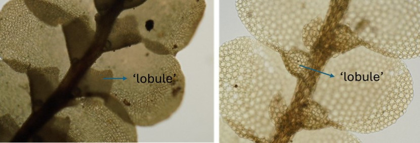 Pada banyak anggota lumut hati berdaun lainnya, ‘lobule’ tersebut sederhana bentuknya. Contoh lumut hati dengan ‘lobule’ daun sederhana di antaranya adalah Radula spp. dan Lejeunea spp. (Gambar 3). Pada Frullania spp., ‘lobule’ ini lebih kompleks dan membentuk kantong. Kantong ini biasanya menggelembung dan memiliki bukaan atau mulut pada salah satu sisinya. Arah bukaan tersebut umumnya berlawanan dengan arah tumbuh batang utama.