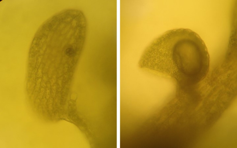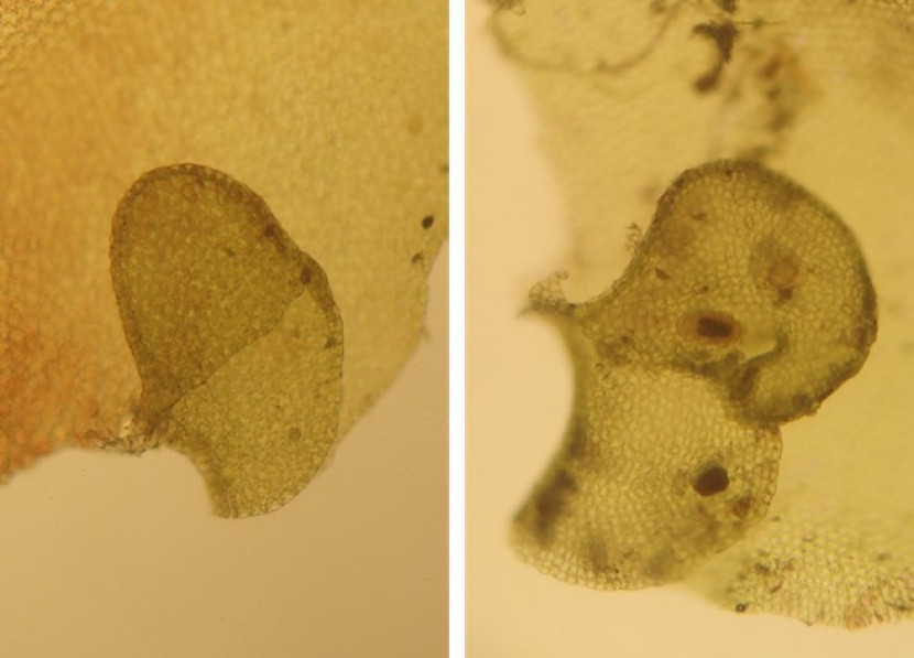 Selain bentuknya, posisi kantong juga penting untuk membedakan antar spesies Frullania. Ada kantong yang posisinya tegak dan sejajar dengan batang utama, ada pula yang posisinya miring dan membentuk sudut terhadap batang utama (Gambar 6).
