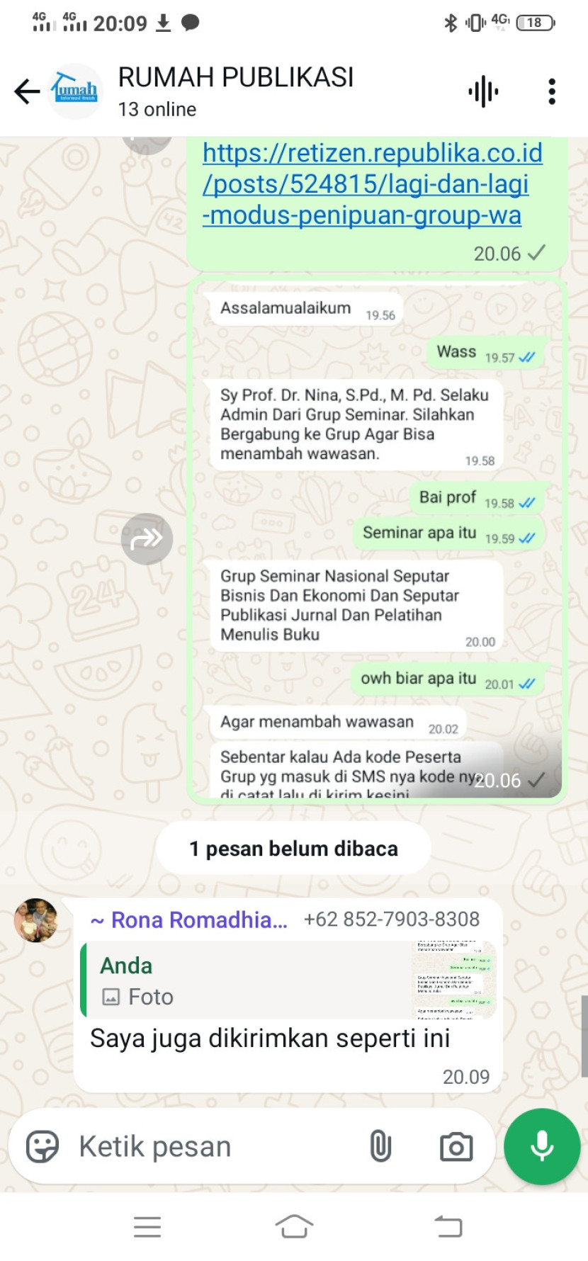 11 Mei 2025 – Penipuan digital kembali marak, kali ini dengan modus berkedok undangan masuk ke grup WhatsApp bertema seminar nasional. Grup tersebut menggunakan nama "Rumah Publikasi" dan mencatut identitas akademik untuk menarik perhatian calon korban.