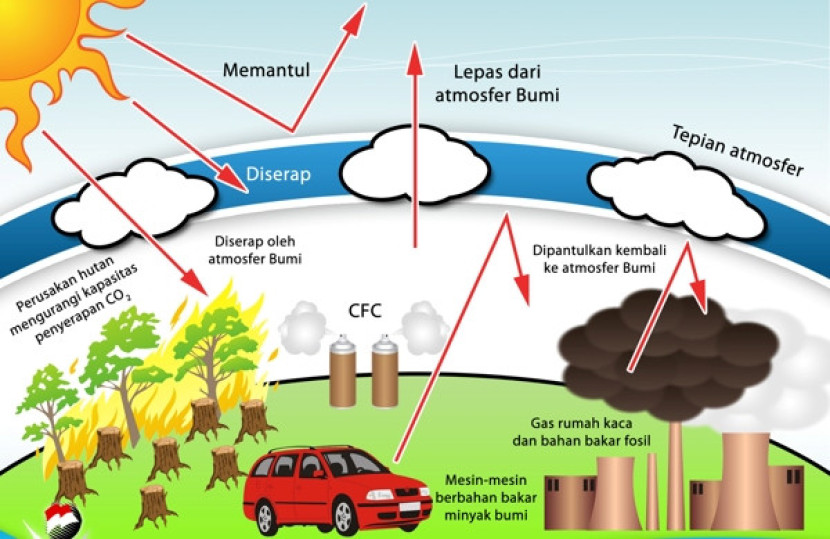 - Gas-gas ini juga memancarkan kembali energi yang diserap ke segala arah, termasuk ke permukaan Bumi, yang meningkatkan suhu