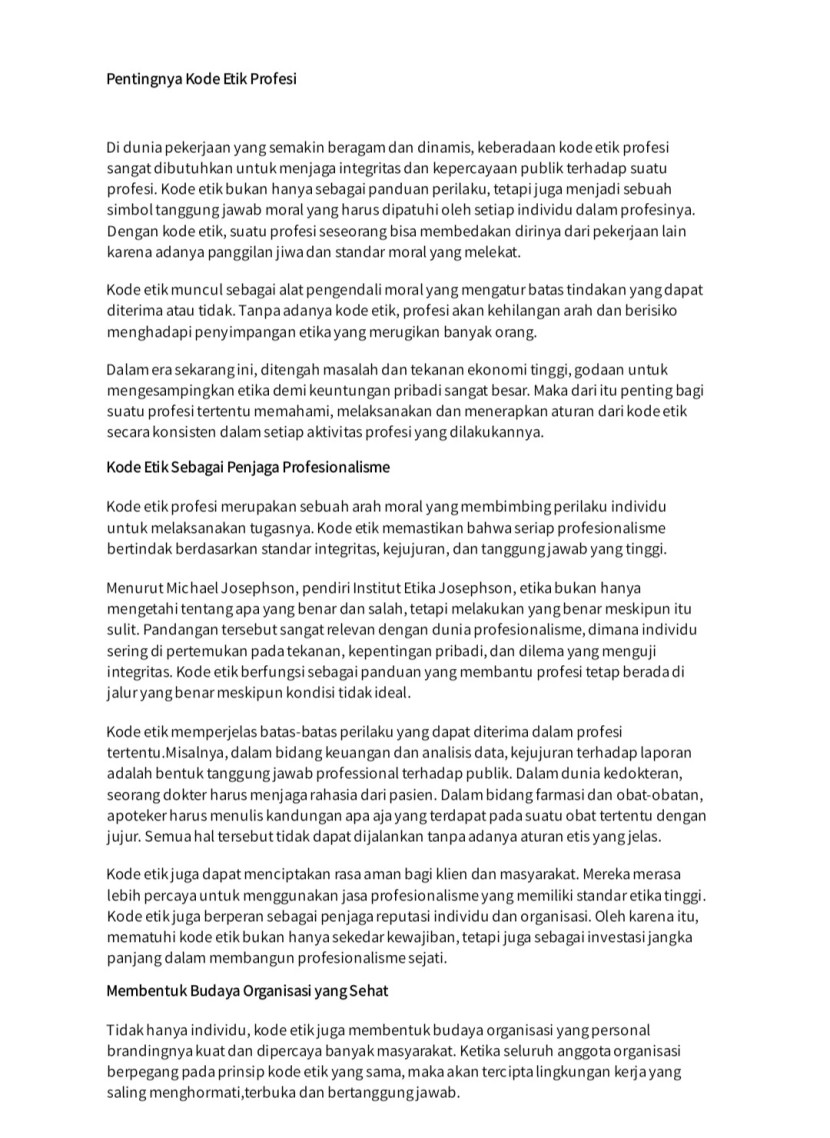 Kode etik profesi merupakan sebuah arah moral yang membimbing perilaku individu untuk melaksanakan tugasnya. Kode etik memastikan bahwa setiap profesionalisme bertindak berdasarkan standar integritas, kejujuran, dan tanggung jawab yang tinggi.Menurut Michael Josephson, pendiri Institut Etika Josephson, etika bukan hanya mengetahui tentang apa yang benar dan salah, tetapi melakukan yang benar meskipun itu sulit. Pandangan tersebut sangat relevan dengan dunia profesionalisme, dimana individu sering dipertemukan pada tekanan, kepentingan pribadi, dan dilema yang menguji integritas.