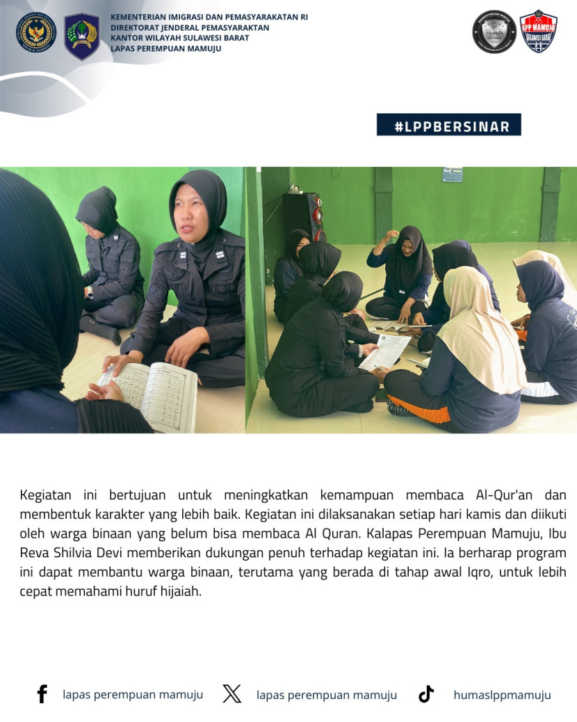 Kalapas Perempuan Mamuju, Ibu Reva Shilvia Devi memberikan dukungan penuh terhadap kegiatan ini. Ia berharap program ini dapat membantu warga binaan, terutama yang berada di tahap awal Iqro, untuk lebih cepat memahami huruf hijaiah.