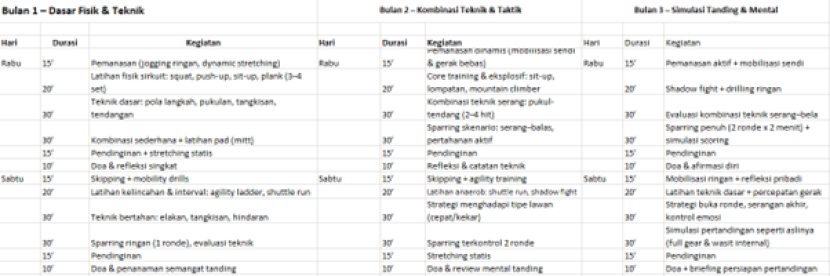 Tabel diatas merupakan hasil dari program yang saya buat melalui AI dengan perintah “buatkan saya program pelatihan yang sederhana tapi efektif dengan latihan setiap minggunya 2x yaitu hari rabu dan sabtu masing" hari hanya memilki waktu 2 jam termasuk pemanasan dan doa untuk pertandingan pencak silat kategori fight yang akan dilaksanakan 3 bulan lagi” dari hasil tersebut kita bisa melihat seberapa canggihnya kecerdasan buatan ini, akan tetapi sebagai pelatih yang berintelektual harus bisa menyesuaikan program-program tersebut dengan faktor lainnya seperti alat yang dimiliki, jumlah atlet, dan kondisi atlet tersebut. Program yang dibuat oleh AI merupakan batu loncatan bagi para pelatih untuk menghasilkan program yang lebih kreatif dan efektif dengan tujuan meningkatkan performa atlet yang maksimal.