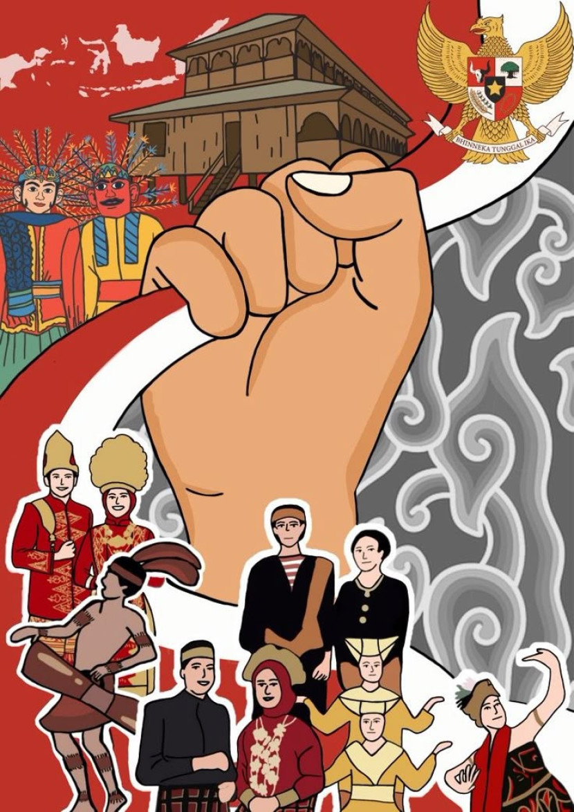 Dalam ilustrasi yang kita lihat, terlihat berbagai perwakilan budaya daerah dari seluruh penjuru Nusantara. Ada ondel-ondel dari Betawi, pakaian adat dari Sumatera, Kalimantan, Papua, Sulawesi, hingga Bali. Di tengah gambar, tampak tangan yang mengepal kuat—simbol bahwa seluruh keberagaman ini bersatu dalam semangat kebangsaan yang sama.