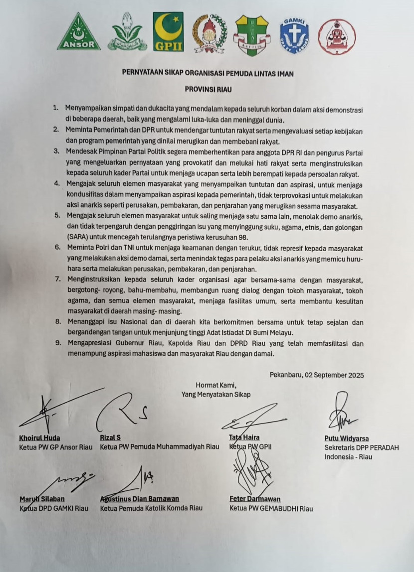 Dalam pernyataannya, para pemimpin pemuda menegaskan pentingnya persatuan dan menolak segala bentuk provokasi maupun tindakan anarkis. Ketua Pimpinan Wilayah Pemuda Muhammadiyah Riau, Rizal S, menegaskan, “Seluruh elemen masyarakat, terutama pemuda, berkomitmen menjaga bangsa ini tetap utuh. Jangan sampai terprovokasi pihak mana pun yang memicu kericuhan,” ujarnya.