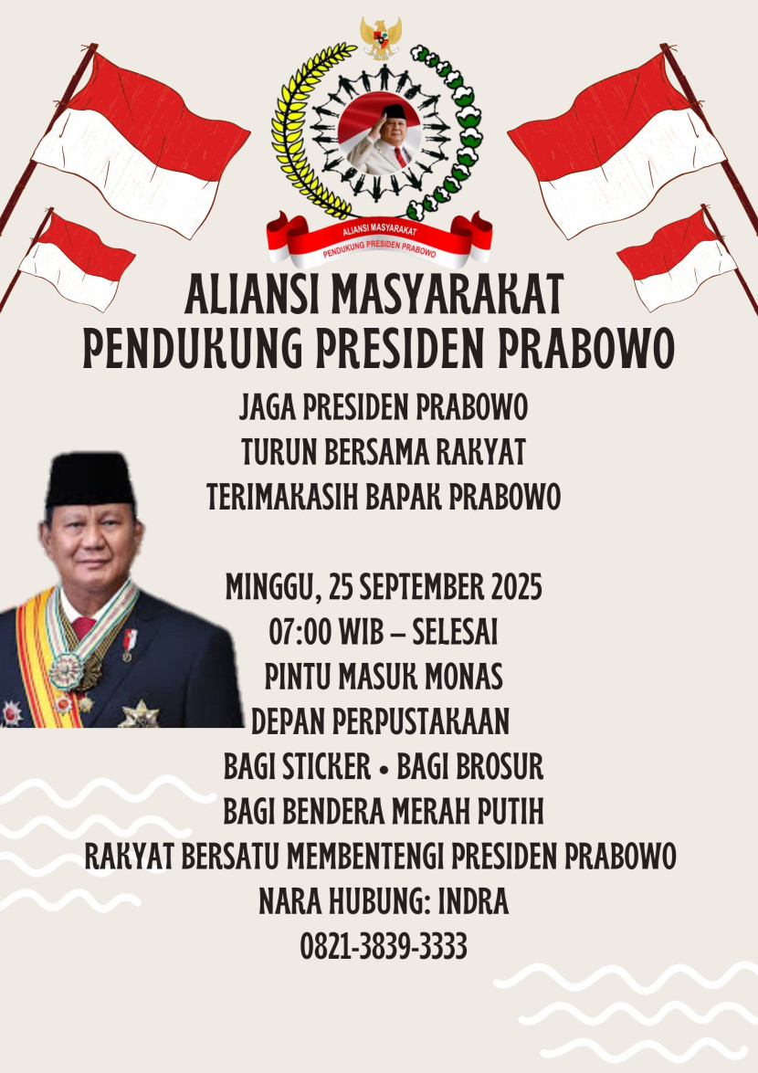 Jakarta – Besok, Minggu 28 September 2025, Aliansi Masyarakat Pendukung Presiden Prabowo (AMPPP) kembali akan menggelar aksi turun ke jalan di kawasan Monas, Jakarta. Aksi ini merupakan minggu ke-4 secara berturut-turut, sebagai bagian dari kegiatan rutin AMPPP untuk mengingatkan masyarakat agar tetap setia berada di bawah komando Presiden Prabowo Subianto.