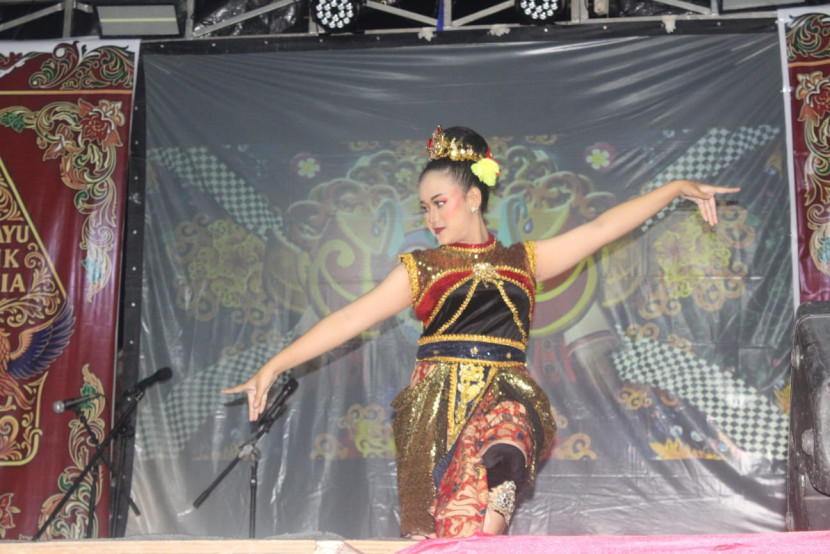 Selain hiburan lucu dan nyanyi bareng, malam itu juga ada penampilan tari tradisional yang menawan. Seorang penari tampil anggun di panggung, mengenakan busana gemerlap dan mahkota kecil di kepala. Gerakannya lembut tapi penuh tenaga, membuat penonton terpukau.