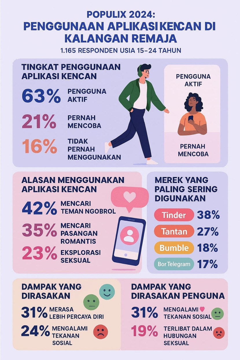 Mengangkat berdasarkan Laporan Indonesian Usage Behavior and Online Security on Dating Apps turut menguatkan temuan ini. Dari 1.165 responden, 63 persen atau sekitar 732 orang mengaku sebagai pengguna aktif aplikasi kencan online. Sebagian besar dari mereka menyatakan bahwa interaksi yang terjalin tidak hanya bersifat sosial, tetapi juga seksual.