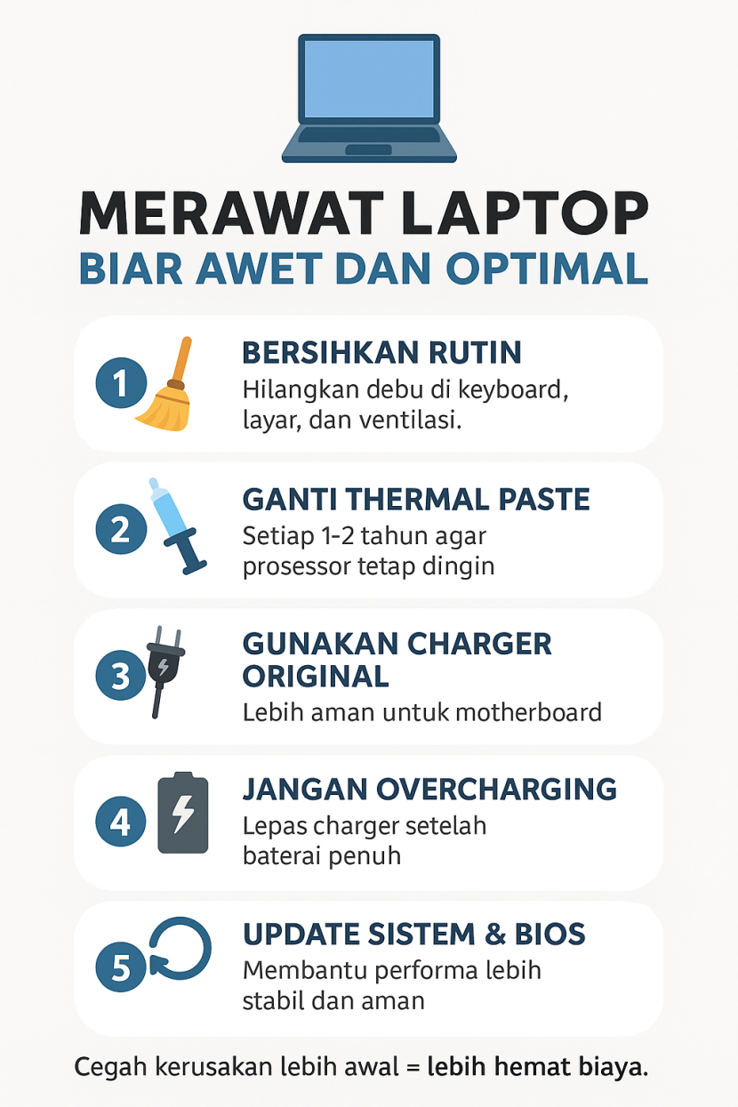 Merawat laptop sejak dini bukan hanya soal menjaga performa, tetapi juga bentuk penghematan jangka panjang. Tips sederhana seperti membersihkan laptop, mengganti thermal paste, hingga memakai charger asli bisa memperpanjang usia perangkat.