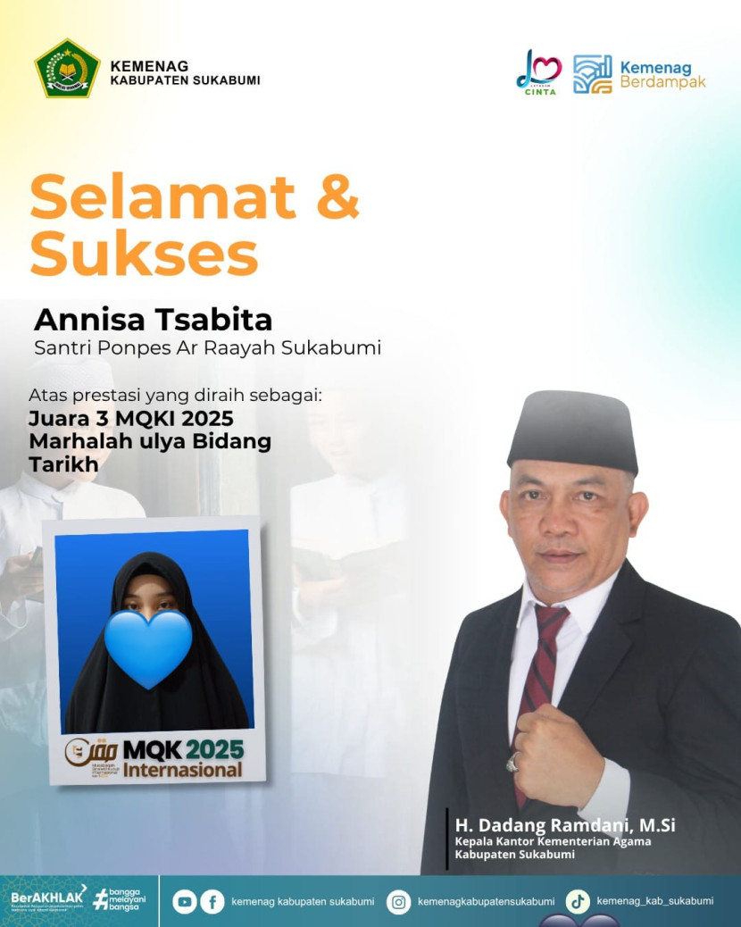 Prestasi Annisa Tsabita sebagai Juara 3 MQKI 2025 bidang Tarikh menjadi bukti bahwa santri Indonesia mampu berkiprah di kancah internasional. Keberhasilannya tidak hanya mengharumkan nama Pondok Pesantren Ar Raayah dan Kabupaten Sukabumi, tetapi juga menggambarkan semangat kebangkitan keilmuan Islam sebagaimana harapan Menteri Agama. Melalui integrasi antara ilmu agama dan ilmu umum, pesantren diharapkan menjadi motor lahirnya kembali Zaman Keemasan Peradaban Islam. Wallahu a'lam Bishshawab.