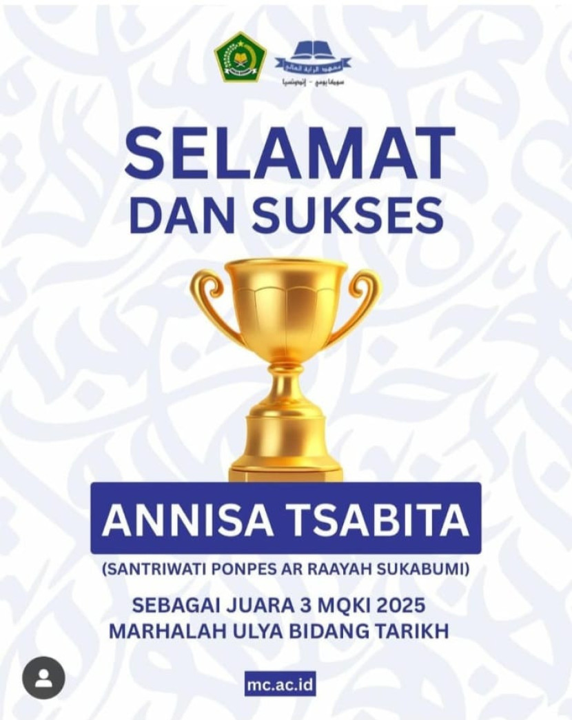 Prestasi membanggakan kembali ditorehkan oleh Mahasantriwati Pondok Pesantren Ar Raayah Sukabumi. Annisa Tsabita, sukses meraih Juara 3 pada ajang Musabaqah Qiraatul Kutub Internasional (MQKI) 2025 tingkat Marhalah Ulya bidang Tarikh. Saat ini ananda menempuh studi pada Semester I Prodi Pendidikan Bahasa Arab Institut Muslim Cendekia asal Sambas, Kalimantan Barat. Meskipun demikian, tidak menjadi penghalang baginya untuk mewakili Kabupaten Sukabumi dan Pondok Pesantren Berbasis Perguruan Tinggi tempatnya menimba ilmu syar'i.