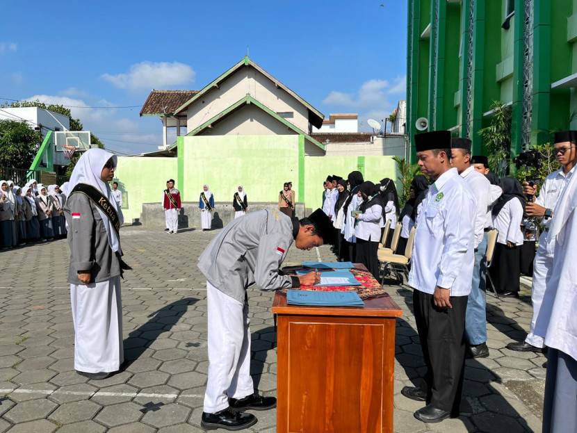 Sekolah | 2025-10-13 14:54:37Bantul (MAN 4 Bantul) - Suasana khidmat menyelimuti halaman MAN 4 Bantul pada Senin (13/10/2025) saat pelaksanaan serah terima jabatan pengurus delapan organisasi siswa secara resmi digelar. Acara ini menjadi momen penting dalam proses regenerasi kepemimpinan di lingkungan madrasah, ditandai dengan penandatanganan berita acara serah terima jabatan oleh pengurus lama, pengurus baru, serta Kepala MAN 4 Bantul, Syaefulani.