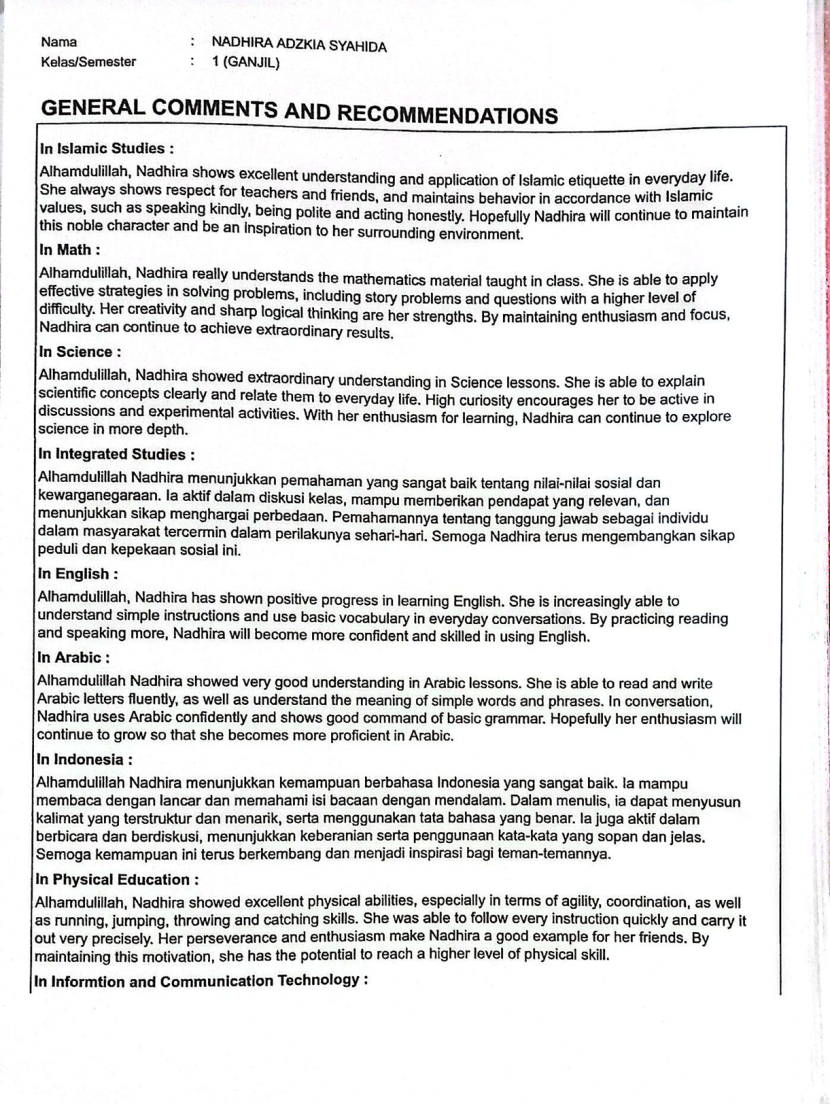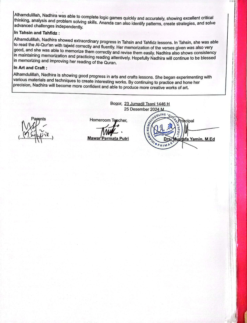 Sebagai bentuk tahadduts binni’mah (rasa syukur mendalam kepada Allah), saya lampirkan capaian belajar anak saya, Nadhira, ketika kelas III Sekolah Dasar. Saat ini Nadhira kelas IV Sekolah Dasar. Semoga bisa menjadi insight untuk menumbuhkan kecintaan terhadap ilmu pada anak-anak kita.