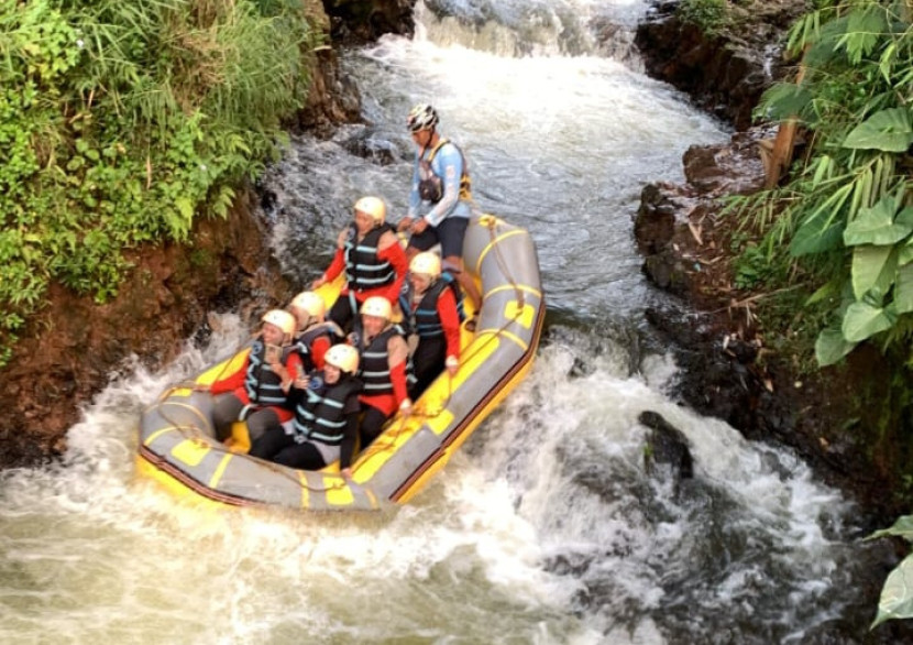 Suara gemuruh air berpadu dengan tawa para peserta yang mencoba menyeimbangkan perahu di tengah arus. Di sepanjang sungai, pemandangan pepohonan hijau dan udara sejuk Pangalengan menjadi latar yang kontras dengan hiruk pikuk pengarungan.