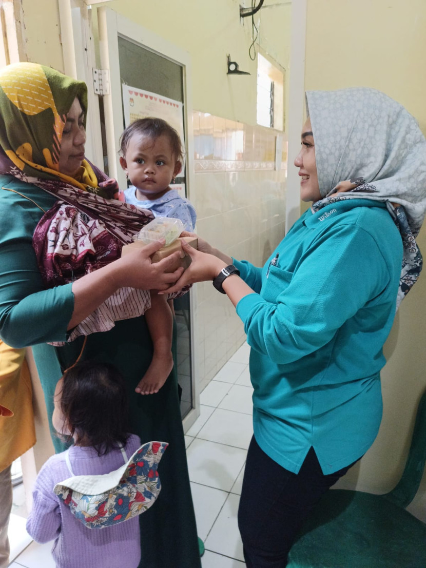 Kegiatan kemudian dilanjutkan dengan pemberian makanan tambahan bergizi seperti telur rebus dan roti. Sambil membagikan makanan, kader menjelaskan manfaat gizi seimbang serta cara menyajikan makanan bergizi di rumah. Pendekatan ini membuat edukasi terasa ringan dan menyenangkan.