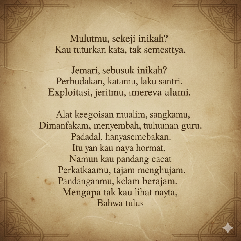 Sastra | 2025-11-07 22:04:51Mulutmu, sekeji inikah? Kau tuturkan kata, tak semestinya. Jemari, sebusuk inikah? Kau gores fitnah, nista pada ulama. Perbudakan, katamu, laku santri. Eksploitasi, jeritmu, mereka alami. Alat keegoisan mualim, sangkamu, Dimanfaatkan, menyembah, menuhankan guru. Padahal, hanya hormat, Itu yang mereka sembahkan. Namun kau pandang cacat, Hatimu terus menyudutkan. Perkataanmu, tajam menghujam. Pandanganmu, kelam merajam. Mengapa tak kau lihat nyata, Bahwa tulus