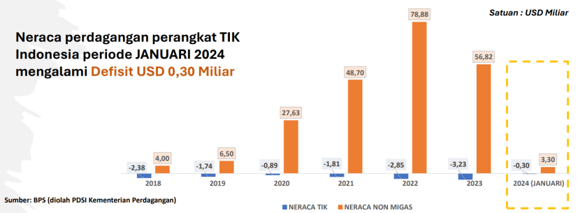 Faktanya, ketergantungan Indonesia pada perangkat keras impor telah menjadi sebuah kerentanan strategis yang serius. Ini bukan sekadar asumsi. Laporan terbaru dari Kementerian Perdagangan mencatat, neraca perdagangan perangkat Teknologi Informasi dan Komunikasi (TIK) Indonesia pada Januari 2024 mengalami defisit sebesar 0,30 miliar dollar AS.