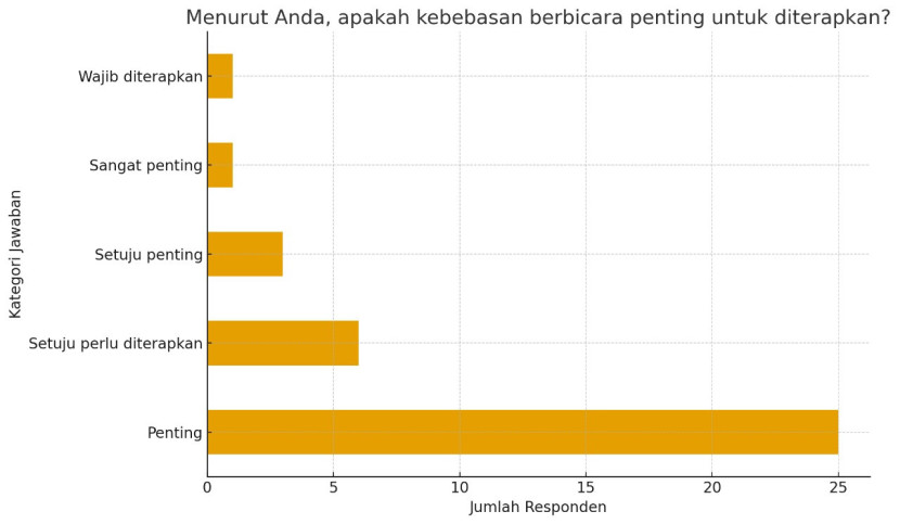 Kebebasan berbicara bukan sekadar kebolehan mengutarakan pikiran, tetapi juga ruang untuk mengekspresikan ide, mendorong kreativitas, dan mengasah kemampuan berpikir kritis. Berdasarkan hasil riset, 98% responden mahasiswa menyatakan bahwa kebebasan berbicara sangat penting dalam kehidupan akademik dan sosial. Namun, mereka juga menyadari bahwa kebebasan tersebut harus disertai tanggung jawab moral agar tidak menyinggung atau merugikan pihak lain.