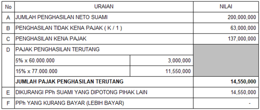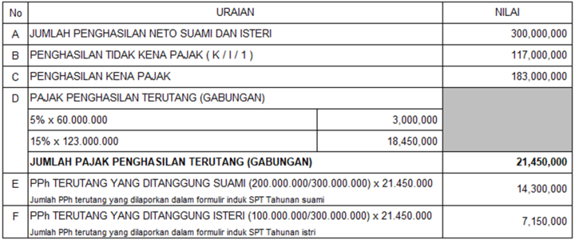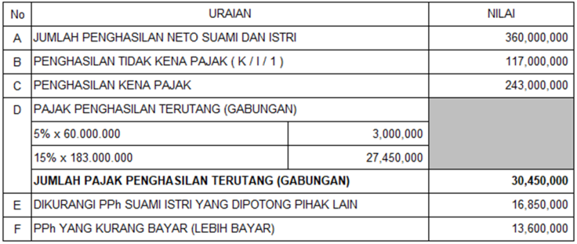 Sedangkan penghitung pajak pada SPT Tahunan suami (jika istri memilih NPWP gabung dengan suami):
