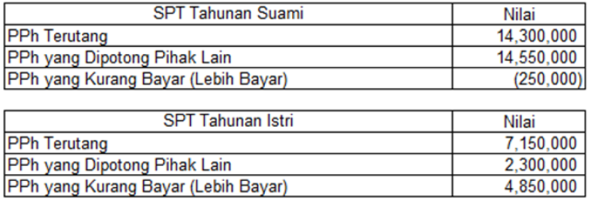 Sedangkan penghasilan istri dari 1 (satu) pemberi kerja PT XYZ sebesar Rp100.000.000,00 dan PPh Pasal 21 yang dipotong sebesar Rp2.300.000,00 dilaporkan pada SPT Tahunan suami sebagai “penghasilan yang dikenakan PPh Final”.