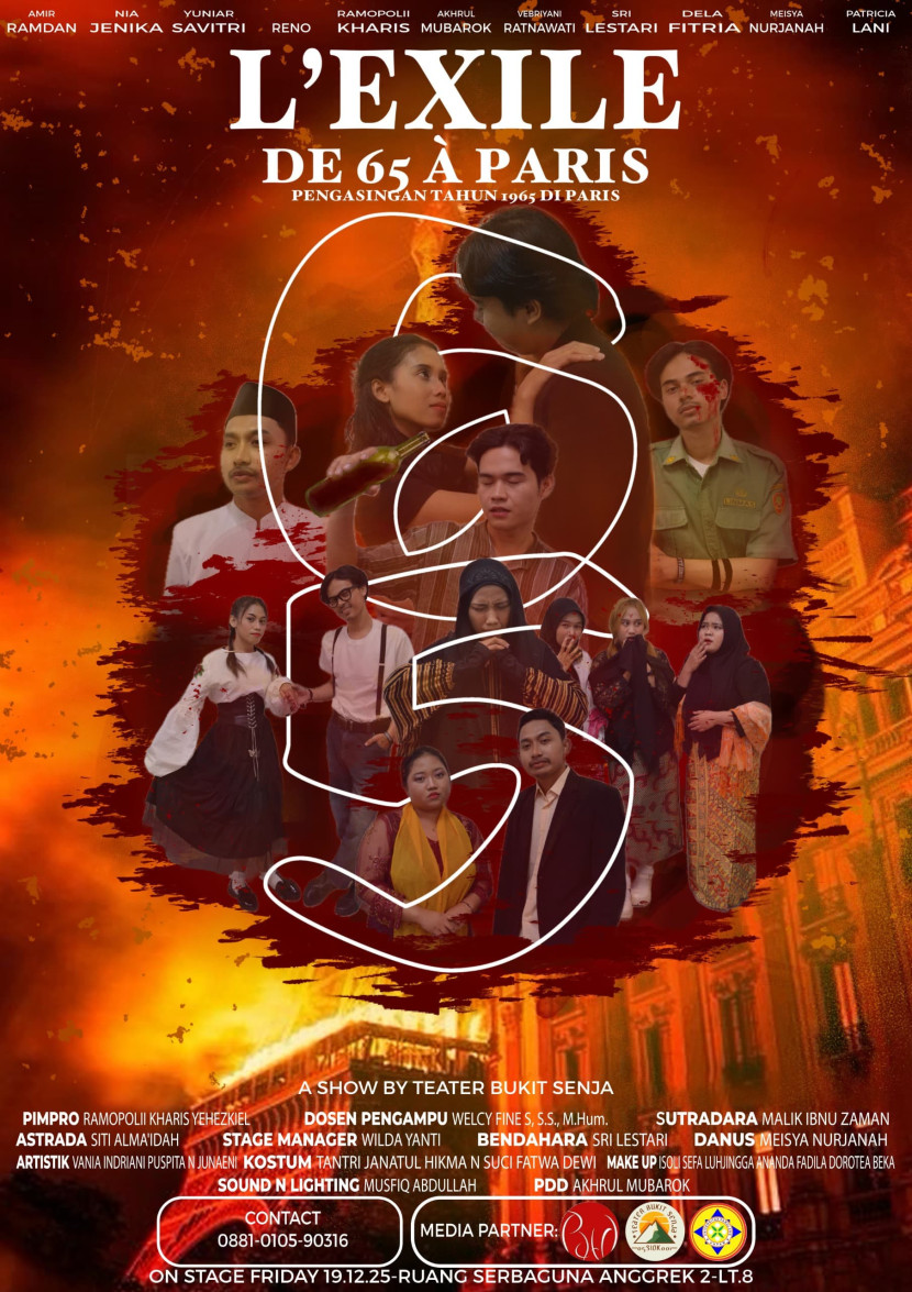 Tangerang Selatan - Teater Bukit Senja sukses menampilkan drama berjudul “L’EXILE DE 65 À PARIS” pada Jumat (19/12/2025) bertempat di Ruang Serbaguna Anggrek 2 lantai 8 Universitas Pamulang, Tangerang Selatan. Pementasan ini menjadi salah satu rangkaian acara Festival Drama Warisan Tahunan (Drawata) Vol. 7.0.Melalui unggahan di akun resmi Instagram @drawata_, dijelaskan bahwa Drawata 2025 menghadirkan delapan pementasan dari delapan kelompok teater mahasiswa Sastra Indonesia semester V Universitas Pamulang. “Festival Drawata kembali hadir dengan tema Simfoni 8 Suara, menyatukan delapan kisah besar dalam satu panggung pertunjukan yang megah,” tulis akun tersebut.Drama “L’EXILE DE 65 À PARIS” yang dipentaskan oleh kelas 05SIDK001 mengambil latar waktu tahun 1965 dan 1995, dengan lokasi cerita di Prancis dan Jawa Tengah. Kisah ini menyoroti masa kelam tragedi 1965 yang menimbulkan banyak korban dengan jumlah yang tidak dapat dipastikan, serta mengiringi peralihan kekuasaan dari Orde Lama menuju Orde Baru.Cerita berpusat pada sosok Claire Ayuningtyas, putri dari seorang eksil 1965 yang hidup di Paris. Ibunya, perempuan Indonesia, masih menyimpan trauma hingga usia tuanya. Di Paris, Claire menjalin hubungan dengan seorang penulis bernama Mathis Lefevre. Demi membantu penyembuhan sang ibu, Claire memutuskan pulang ke Indonesia bersama ibunya. Namun, keputusan tersebut ditentang oleh Mathis karena kondisi politik Indonesia yang masih berada di bawah rezim otoriter dan represif.Pementasan ini berada dalam arahan Welcy Fine, dengan produser Ramopoli Kharis Yehezkiel. Malik Ibnu Zaman bertindak sebagai sutradara sekaligus penulis naskah, dibantu oleh Siti Almaidah sebagai asisten sutradara. Posisi manajer panggung dipegang Wilda Yanti, bendahara oleh Sri Lestari, dan divisi dana usaha oleh Meisya Nurjanah. Tim artistik terdiri atas Vania Indriani Puspita dan Junaeni. Penata kostum adalah Tantri Janatul Hikma dan Suci Fatwa Dewi, sementara tata rias ditangani oleh Isoli Loh Jingga, Amanda Fadila, dan Dorote Beka. Musik dan pencahayaan dikelola Musyfiq Abdillah, serta dokumentasi oleh Akhrul Mubarok.Vebriyani Ratnawati memerankan Claire Ayuningtyas, sedangkan Ramopoli Kharis berperan sebagai Mathis Lefevre, dan Akhrul Mubarok sebagai Julian Delacroix. Tokoh Ratri Lestari Tua dimainkan oleh Yuniar Savitri dan versi mudanya diperankan Nia Jenika. Reno tampil sebagai tentara dan penari 1, Amir Ramdan memerankan Philippe Dubois dan Bung Besar, sementara Patricyia Lani berperan sebagai penari 2 dan tokoh perempuan. Sri Lestari, Dela Fitria, dan Meisya Nurjanah masing-masing memerankan Perempuan 1, Perempuan 2, dan Perempuan 3.
