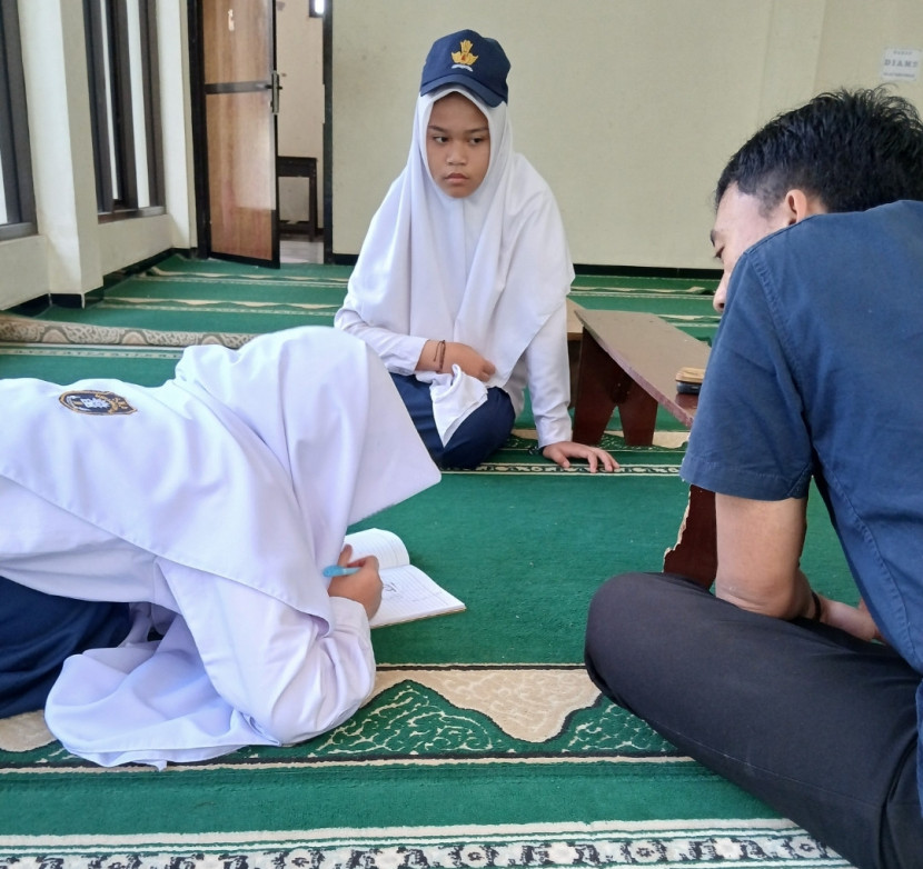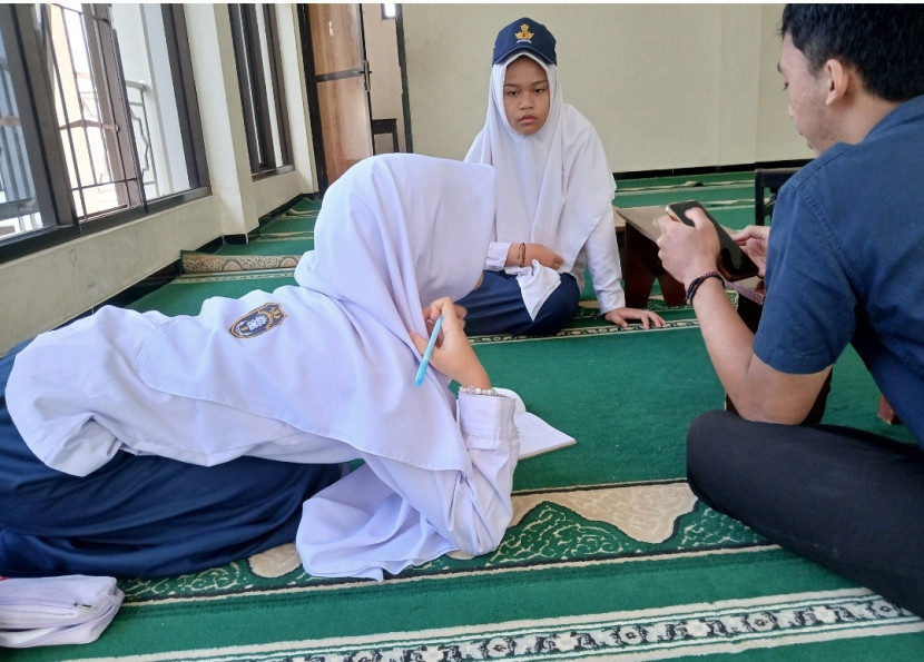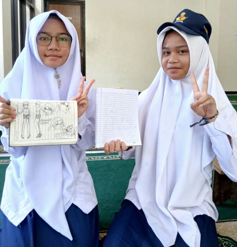 Bagi Haninda, yang telah setahun bergabung dalam program inklusi sejak kelas 7, waktu bukan sekadar deretan angka di jam dinding. Saat teman-temannya bersujud di lantai bawah, Haninda justru sedang asyik "bersujud" pada imajinasinya. Ia duduk di lantai, jemarinya lincah menggerakkan pena di atas lembar buku tulis.