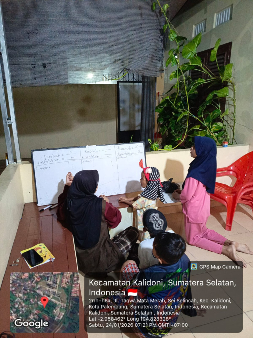 Agama | 2026-01-25 15:12:37Mahasiswi Kuliah Kerja Nyata (KKN) rekognisi tematik angkatan 84A kelompok 214 Universitas Islam Negeri (UIN) Raden Fatah Palembang yang bertempat di Jl. Taqwa Mata Merah Lr. H. Effendi RT. 23 RW. 05, Kelurahan Sei Selincah, Kecamatan Kalidoni, Kota Palembang mengadakan program pendidikan dasar keislaman yang bertujuan memperkuat moderasi beragama. Kegiatan ini dikelola oleh Viona Wulandari, seorang mahasiswi program studi Pendidikan Agama Islam Fakultas Ilmu Tarbiyah dan Keguruan peserta KKN rekognisi tematik Angkatan 84A. Kegiatan ini berfokus pada pembelajaran baca tulis Al-Qur’an, harakat dasar, dan hafalan doa pendek sehari-hari.