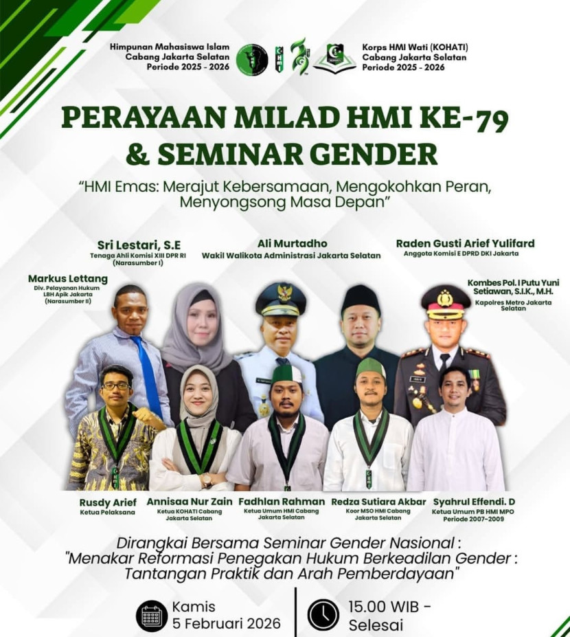 Perayaan Kelahiran Himpunan Mahasiswa Islam ke-79 & Seminar Gender bertajuk “ HMI Emas Merajut Kebersamaan, Mengokohkan Peran, Menyongsong Masa Depan” dengan topik seminar “menakar reformasi penegakan hukum berkeadialan gender; tantangan praktik dan arah pemberdayaan”