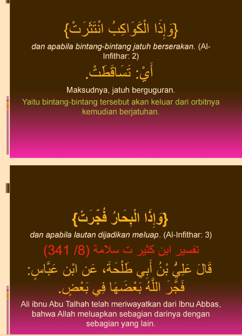 - Terjemahan: Dan apabila bintang-bintang jatuh berserakan. (Al-Infithar: 2)