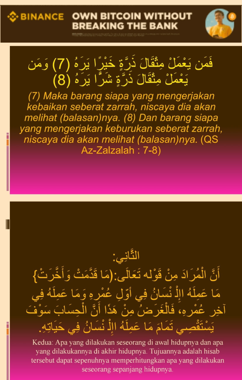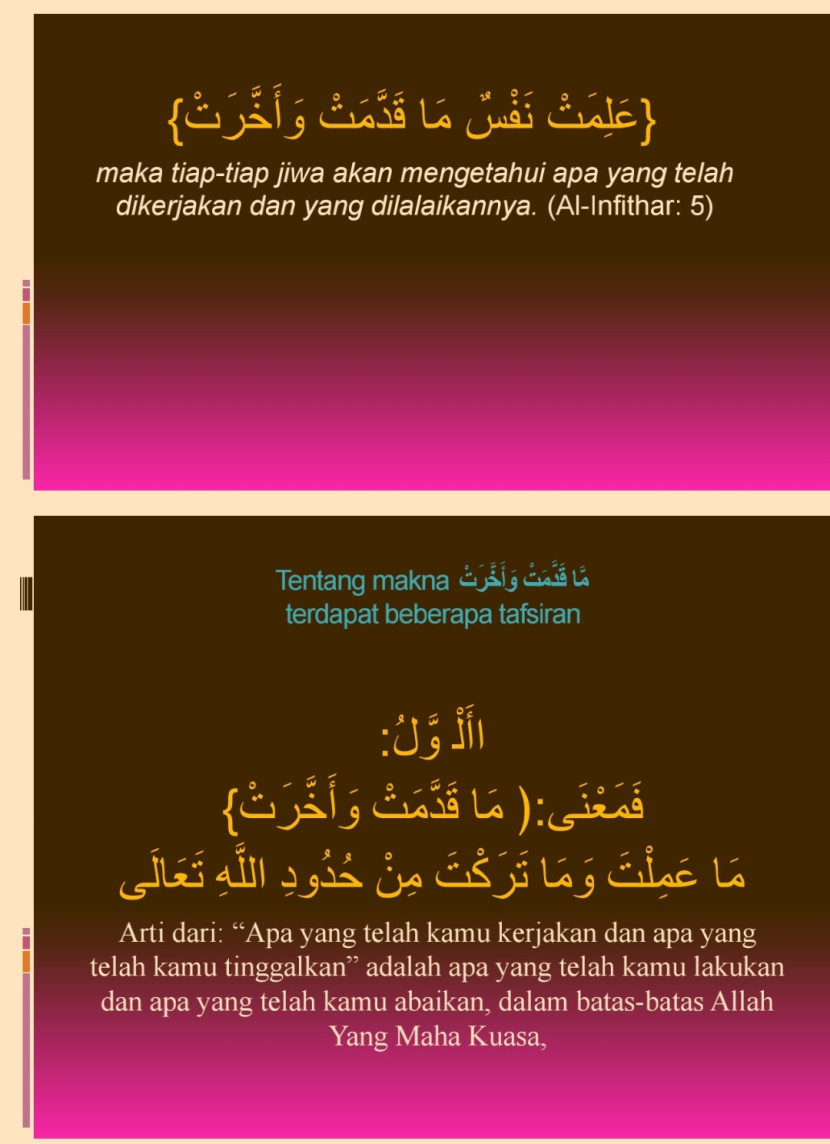 - Terjemahan: Maka tiap-tiap jiwa akan mengetahui apa yang telah dikerjakan dan yang dilalaikannya. (Al-Infithar: 5)
