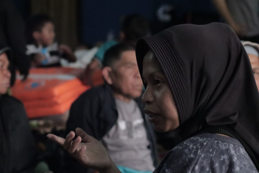 Wiwi, orang tua Tini, ikut mengungsi bersama anak dan cucunya. Meski usia tak lagi muda, ia berusaha tegar menghadapi situasi.