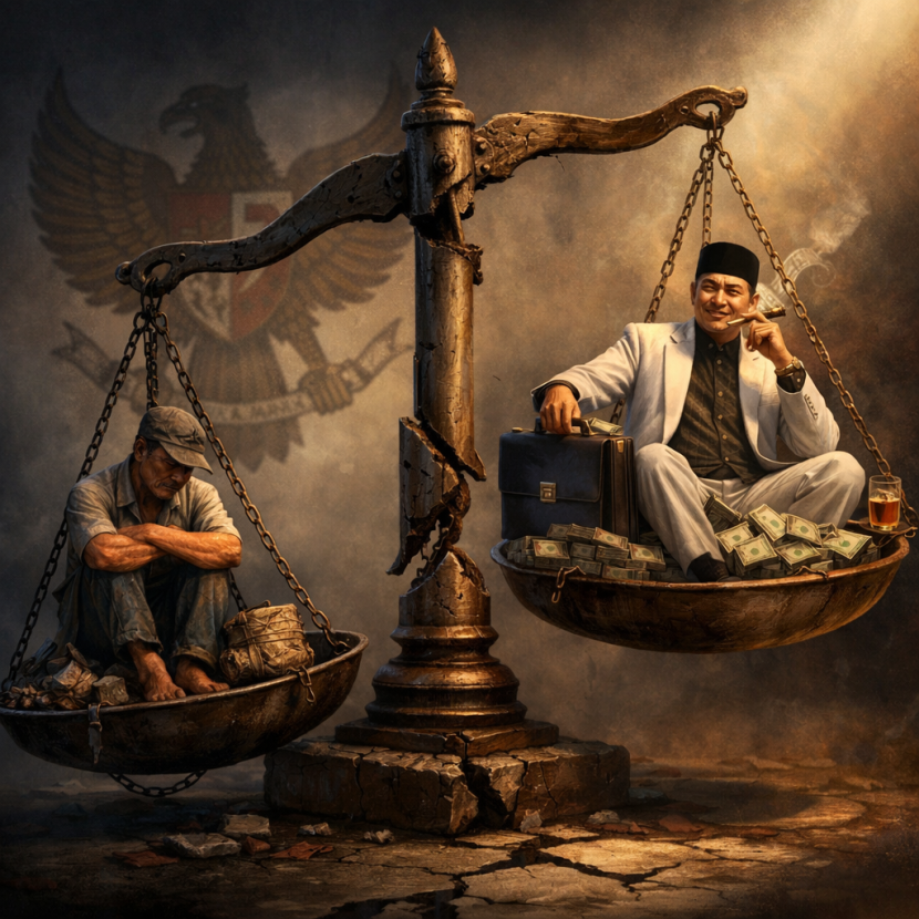 Dalam praktiknya, penegakan hukum di Indonesia kerap dinilai timpang. Istilah “tajam ke bawah, tumpul ke atas” bukan lagi sekedar kritik, melainkan cerminan kegelisahan masyarakat yang terus berulang. Masyarakat kecil seringkali harus menerima hukuman yang berat, sementara mereka yang memiliki kekuatan ekonomi atau politik justru tampak lebih mudah mendapatkan keringanan. Kondisi ini jelas bertentangan dengan prinsip kesetaraan di hadapan hukum yang seharusnya dijunjung tinggi.